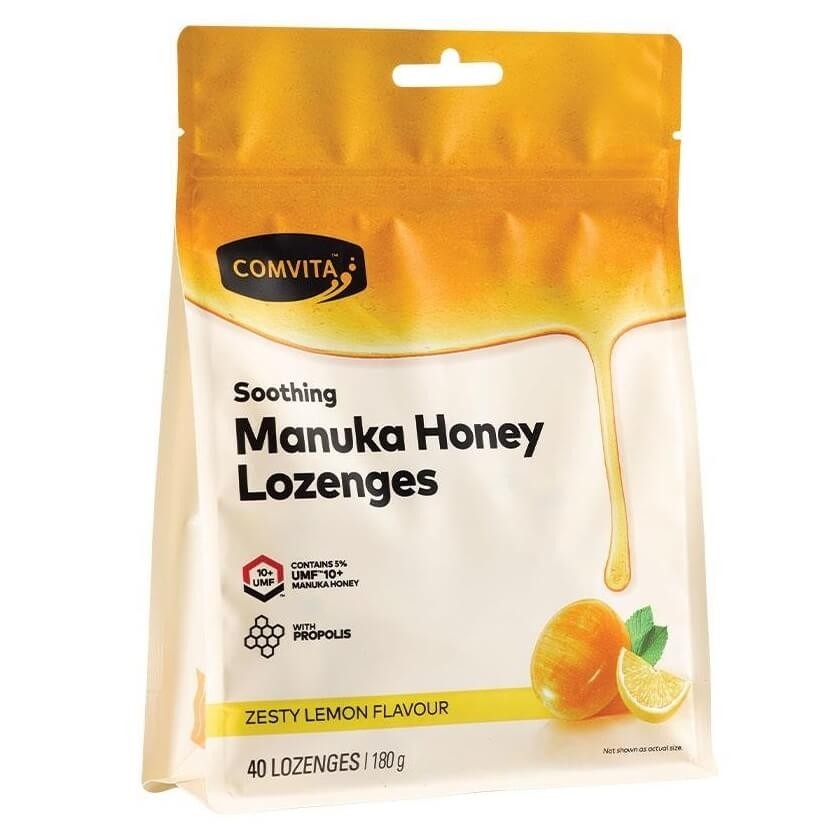 Genuine Mānuka honey is one of nature’s rare and powerful wonders, renowned the world over for its beneficial properties. It contains a unique range of oligosaccharides and prebiotics, amino acids, polyphenolic and other plant-derived compounds. Great as a morning wellness ritual, pre-workout natural energy source, or as a DIY skin-brightening facemask. Smooth and creamy, it tastes delicious too. Try the soothing taste of Mānuka honey lozenges with zesty lemon flavouring. They are made with genuine UMF™ 10+ Mānuka honey from New Zealand. Mānuka honey is rare and unique with well-known properties. Bee propolis is created by bees to protect their own hives. Propolis contains high levels of active bioflavonoids with well-known properties. Add a bit of lemon and it tastes great. Dissolve one lozenge slowly in the mouth.